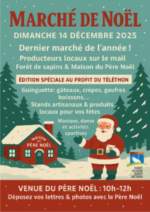 Le 14 décembre sera le dernier marché de l’année 2025, tout d’abord sur le mail les producteurs locaux habituels, puis en suivant la forêt de sapins et la maison du père Noël, venez profiter de cette édition couplée avec au Profit du Téléthon, la guinguette (vente de gâteaux, crêpes, gaufres, boissons,…) ainsi que des productions artisanales et des produits locaux pour vous approvisionner pour les fêtes! Un moment festif avec de la musique, de la danse et des activités sportives sans oublier la venue du Père Noël de 10h à 12h, l’occasion de déposer vos lettres et de faire une photo avec le vieux monsieur à la barbe blanche.